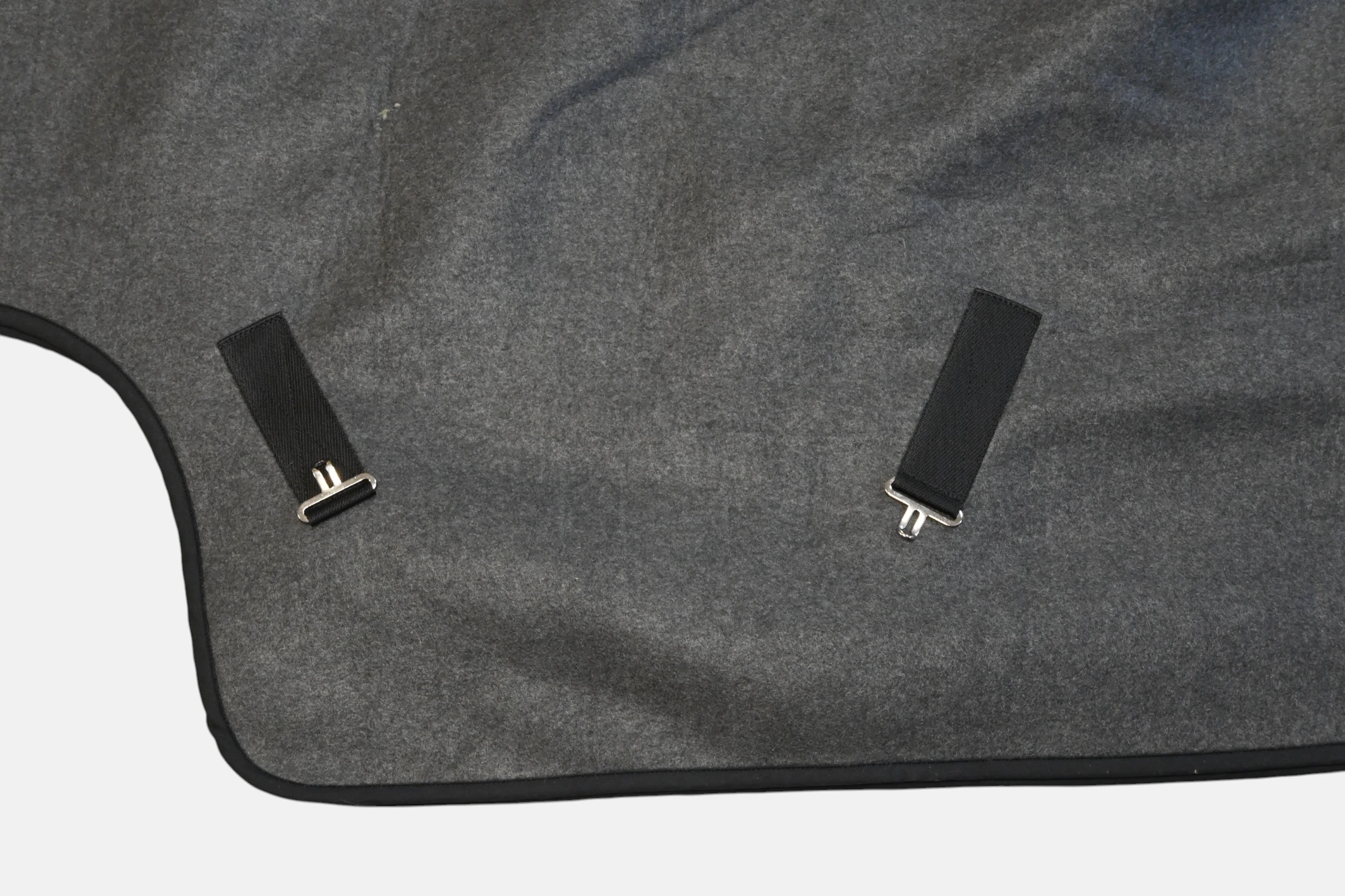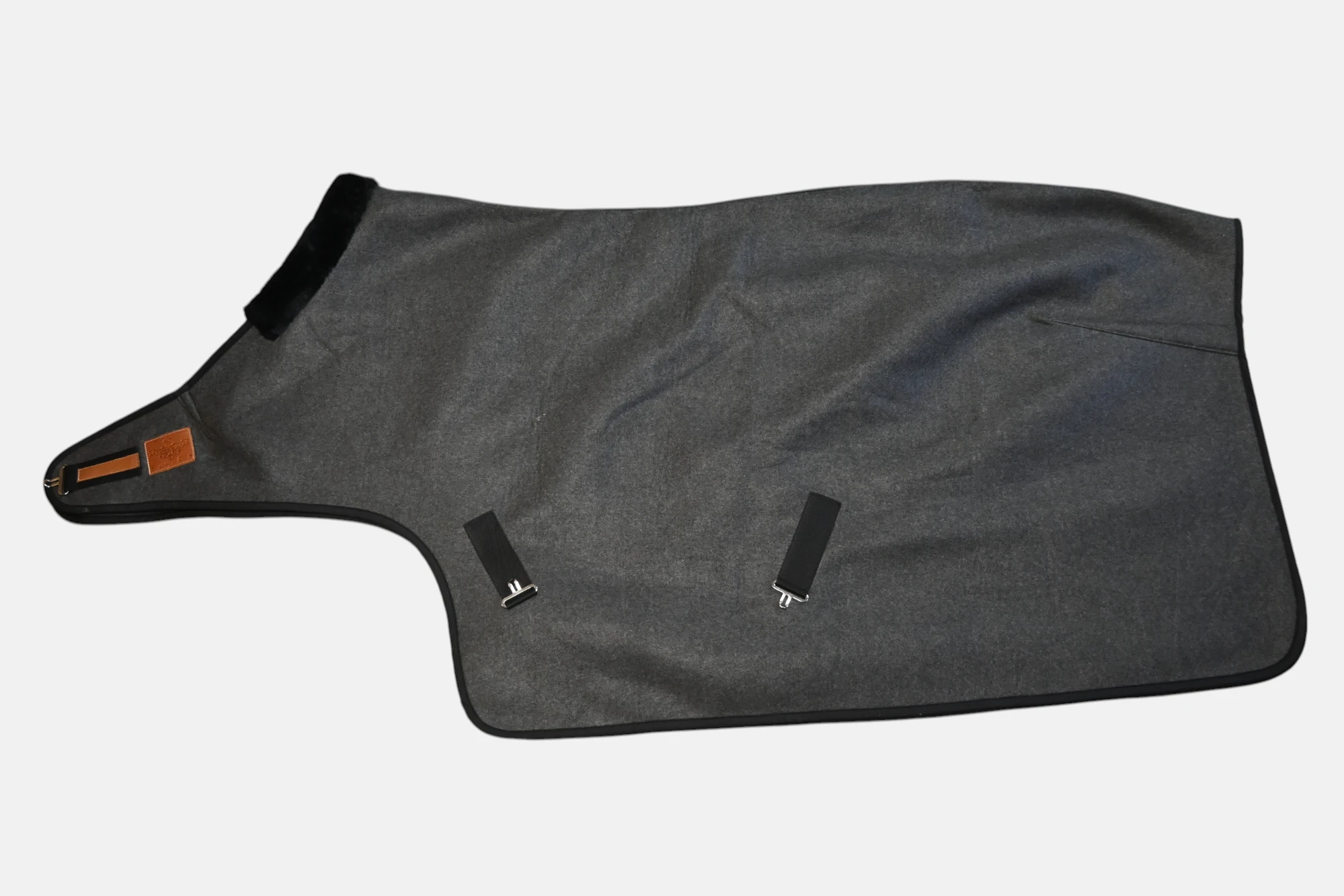 Couverture de marcheur Wooltouch en gris chiné, chaude et confortable, avec renfort en fausse fourrure au garrot, fermeture par boucle et sangles croisées sous le ventre.